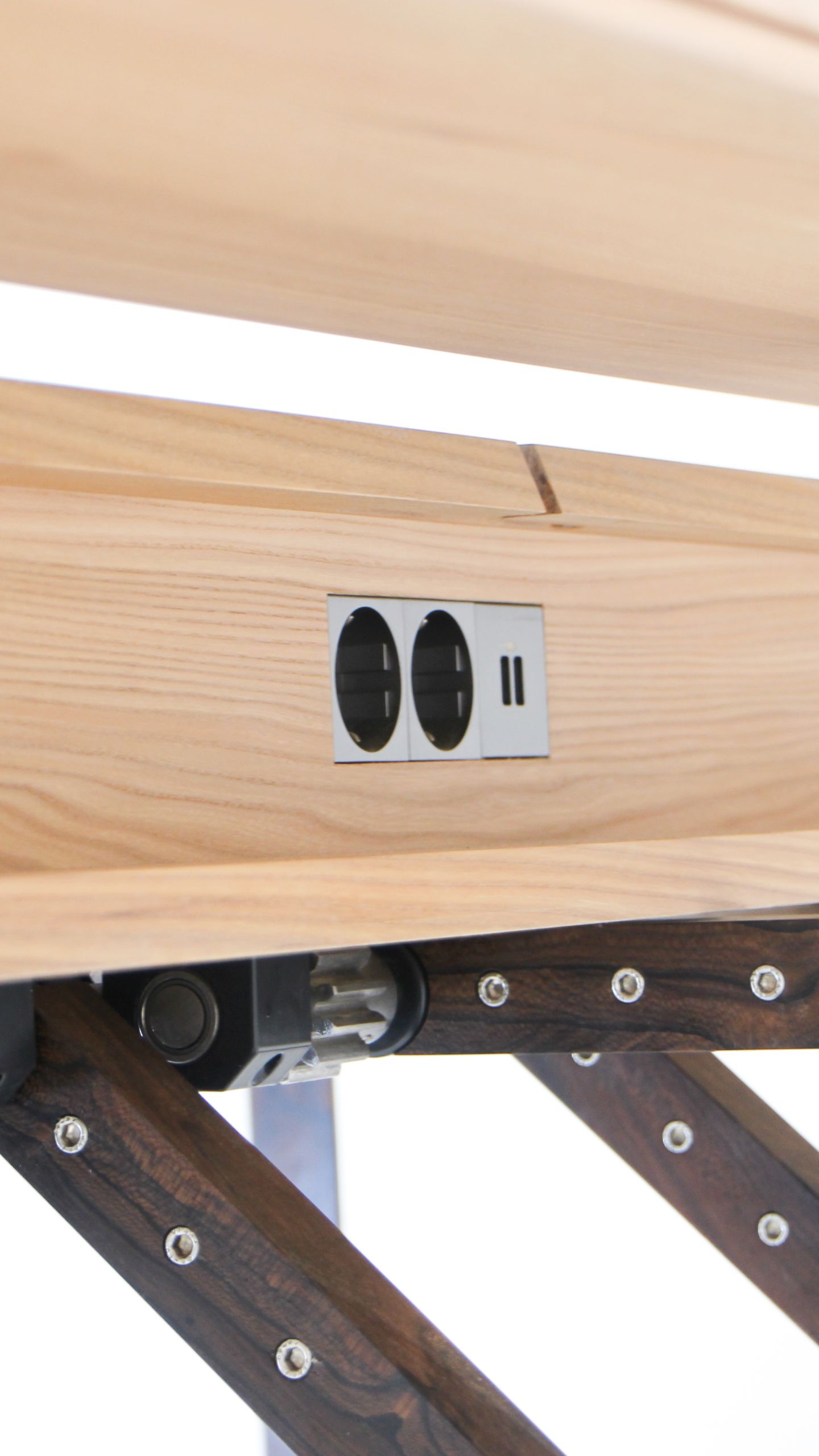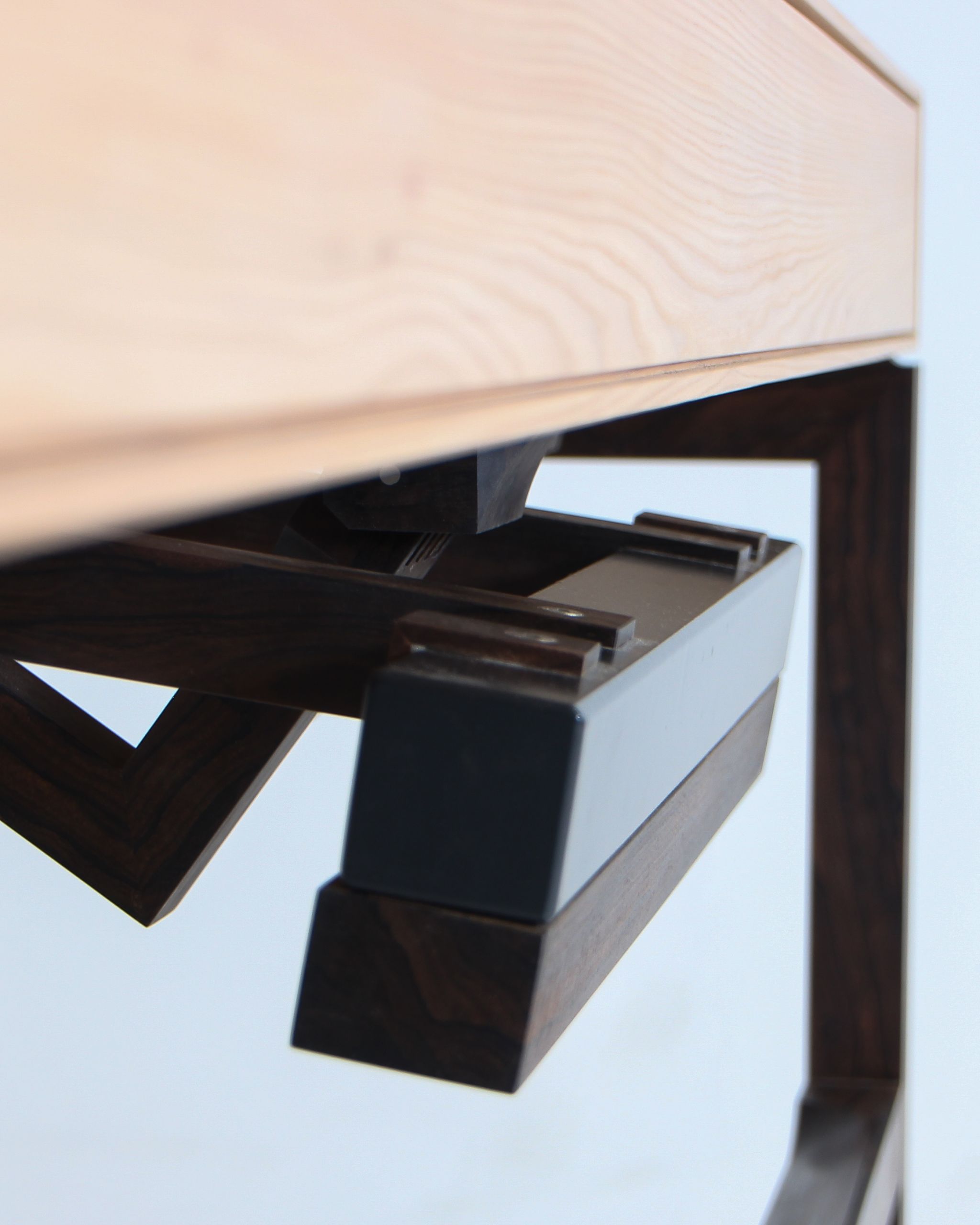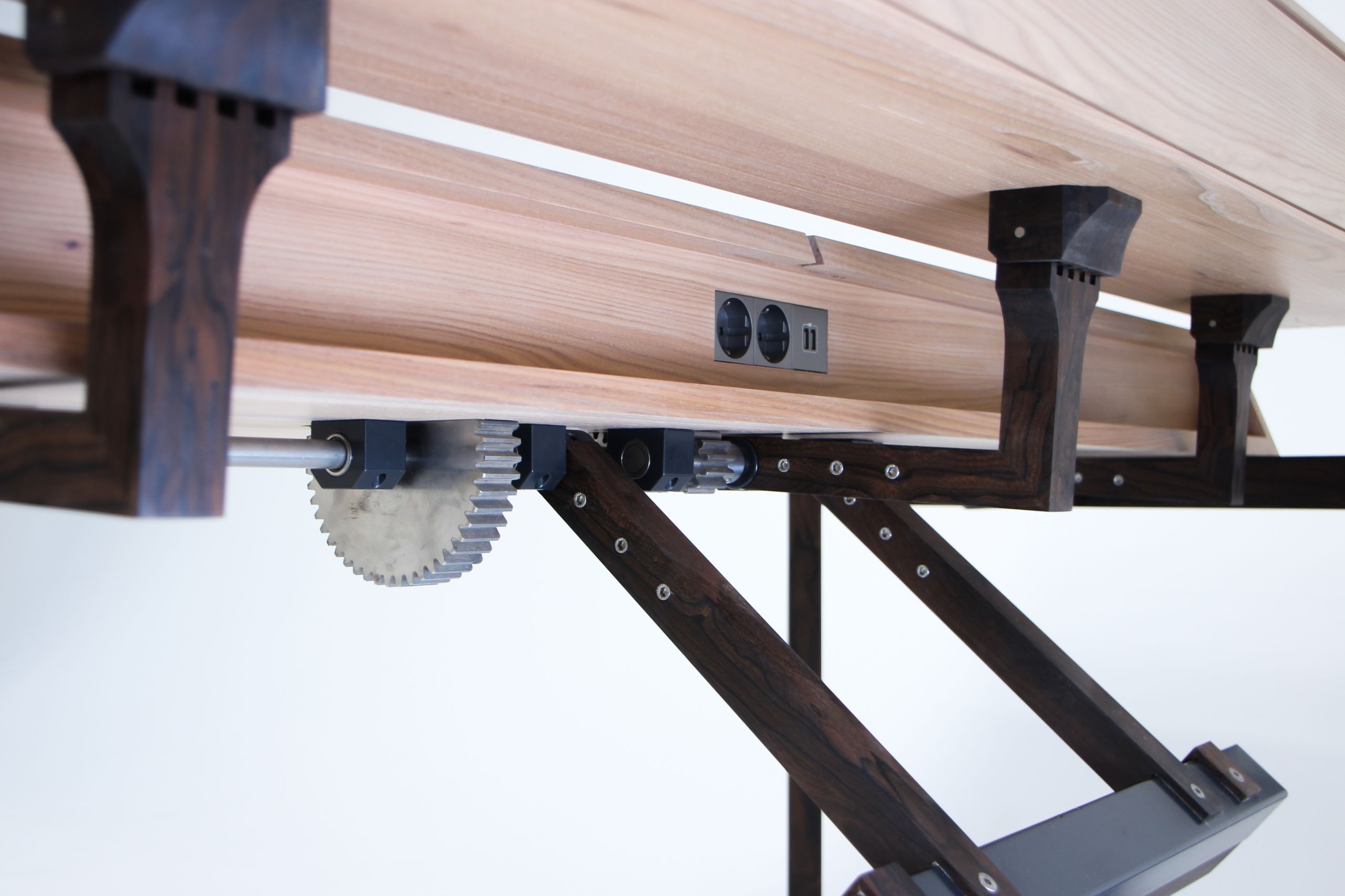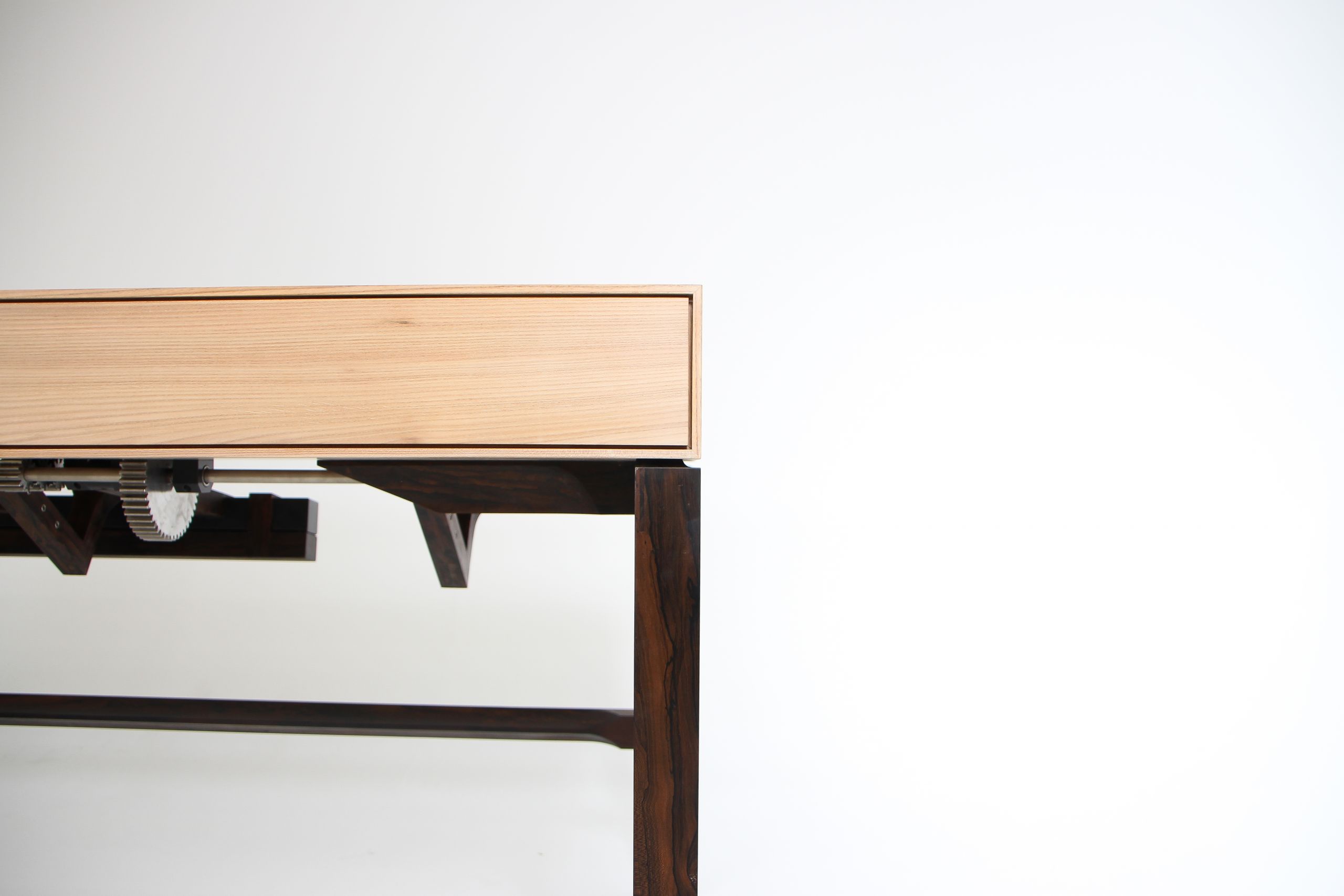 Inspired by a traditional workbench that uses the rear table area as storage, I created this handcrafted desk as my journeyman’s piece. To quickly clear the workspace, the rear compartment can be lowered with a self-developed motorized mechanism.